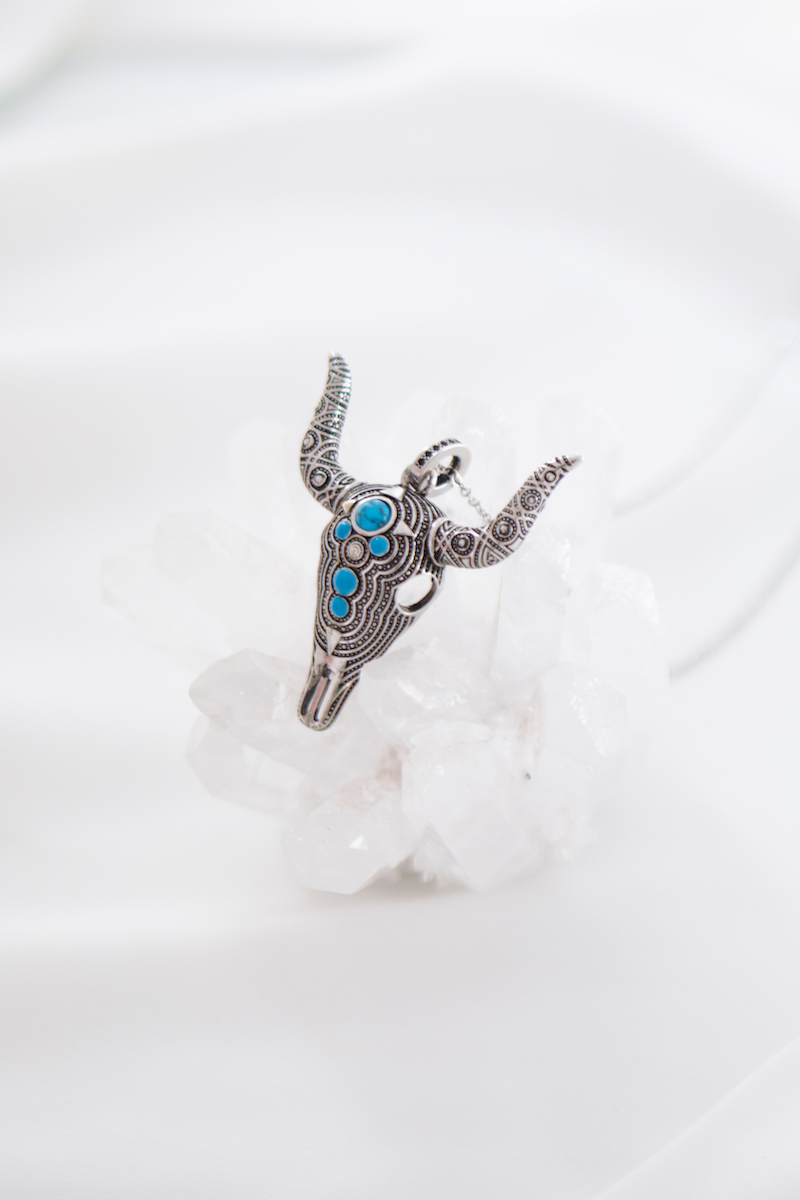 El Buffalo Karma representa la conexión con la naturaleza y la esencia del gran espíritu. Considerado un animal sagrado por muchas culturas nativas y un poderoso símbolo de fuerza y protección. La joya es una cabeza de búfalo fabricada en Plata de Ley 925 con grabados de estilo étnico, partes esmaltadas y una piedra turquesa en el centro de la pieza.