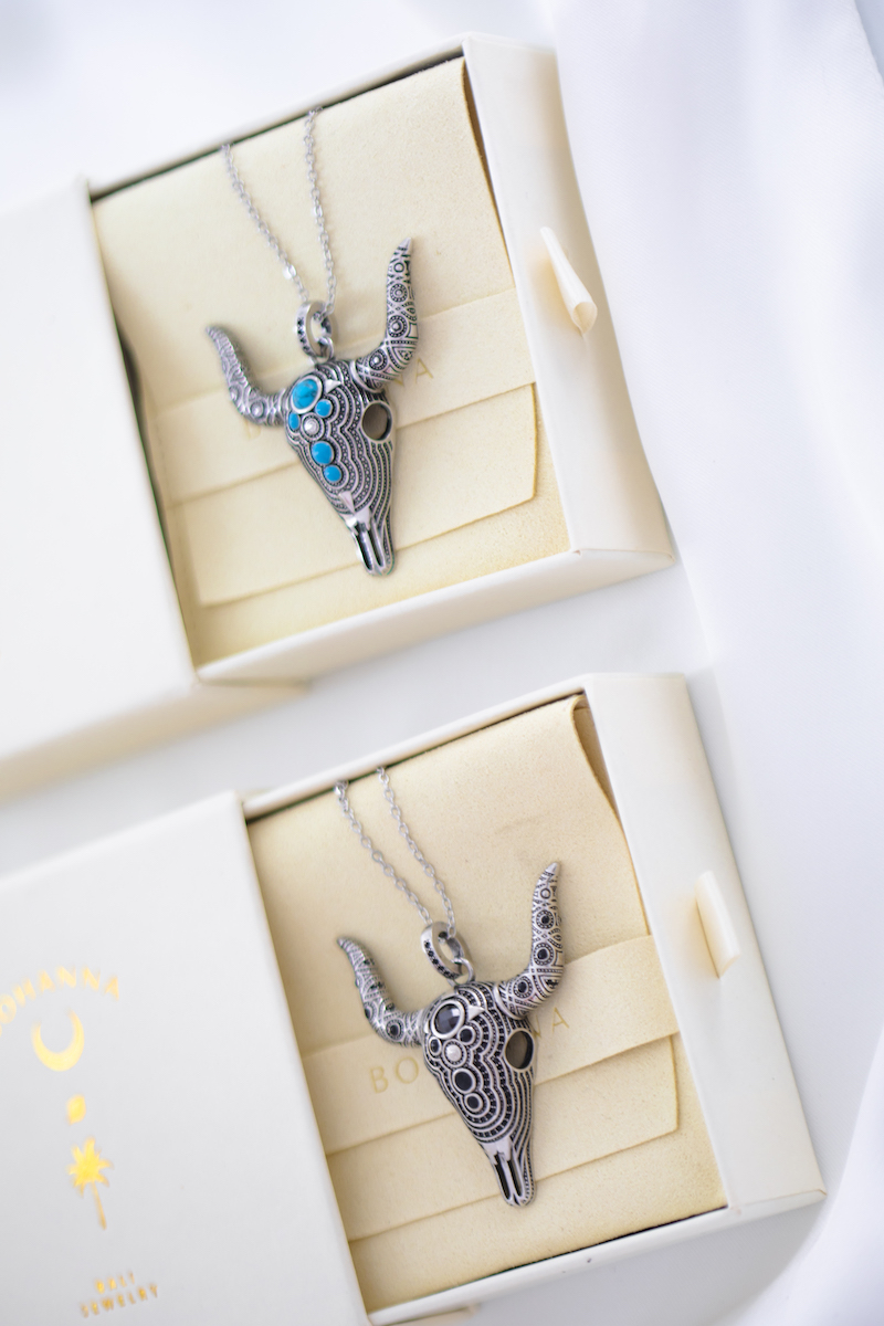 El Buffalo Karma representa la conexión con la naturaleza y la esencia del gran espíritu. Considerado un animal sagrado por muchas culturas nativas y un poderoso símbolo de fuerza y protección. La joya es una cabeza de búfalo fabricada en Plata de Ley 925 con grabados de estilo étnico, partes esmaltadas y una piedra turquesa en el centro de la pieza.