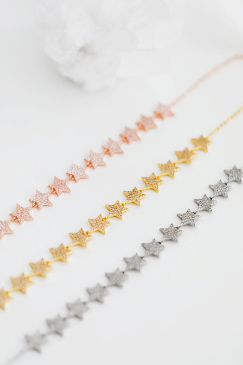 El Choker Padang es una gargantilla formada por estrellas que están adornadas con circonitas. Puedes elegir entre color Plata, Oro y Rosa.