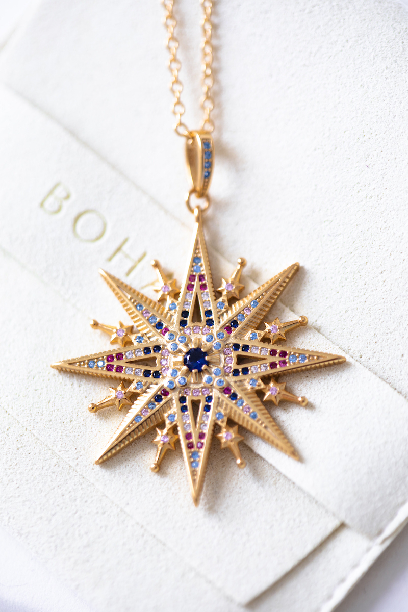 La Estrella Bingin es una pieza celestial que captura la esencia del cielo de Bali y lo místico de la isla. Con sus 8 puntas doradas que brillan con intensidad, esta joya evoca la magia de las estrellas en una noche despejada. Las circonitas de diferentes colores que adornan la estrella representan la diversidad y la armonía de la naturaleza, mientras que su baño en oro le confiere un brillo etéreo. Llevar esta joya es como llevar un pedacito del cielo en tu corazón, recordándote la conexión entre el mundo terrenal y el mundo espiritual. Es un símbolo de protección y guía en tu viaje hacia lo desconocido.