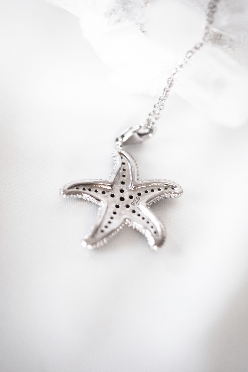 Esta pieza exhibe la forma delicada y elegante de una estrella de Mar, elaborada en Plata de Ley 925 y adornada con circonitas verdes.